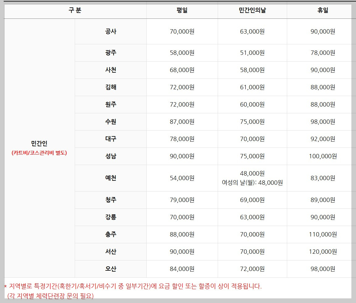 | 민간인 | 약 60,000원~80,000원 | 110,000원 | 체력단련장별 차이 있음 |
