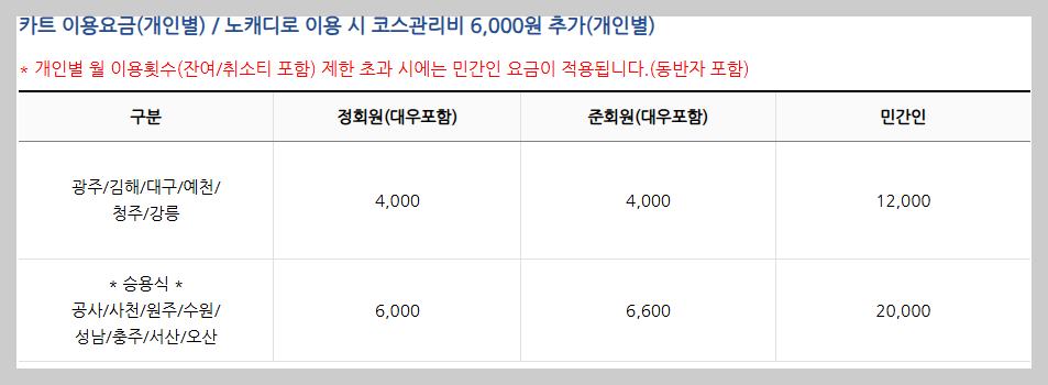 | 렌탈카트 추가요금 | 약 5,000원 | 선택형(체력단련장별 상이) |