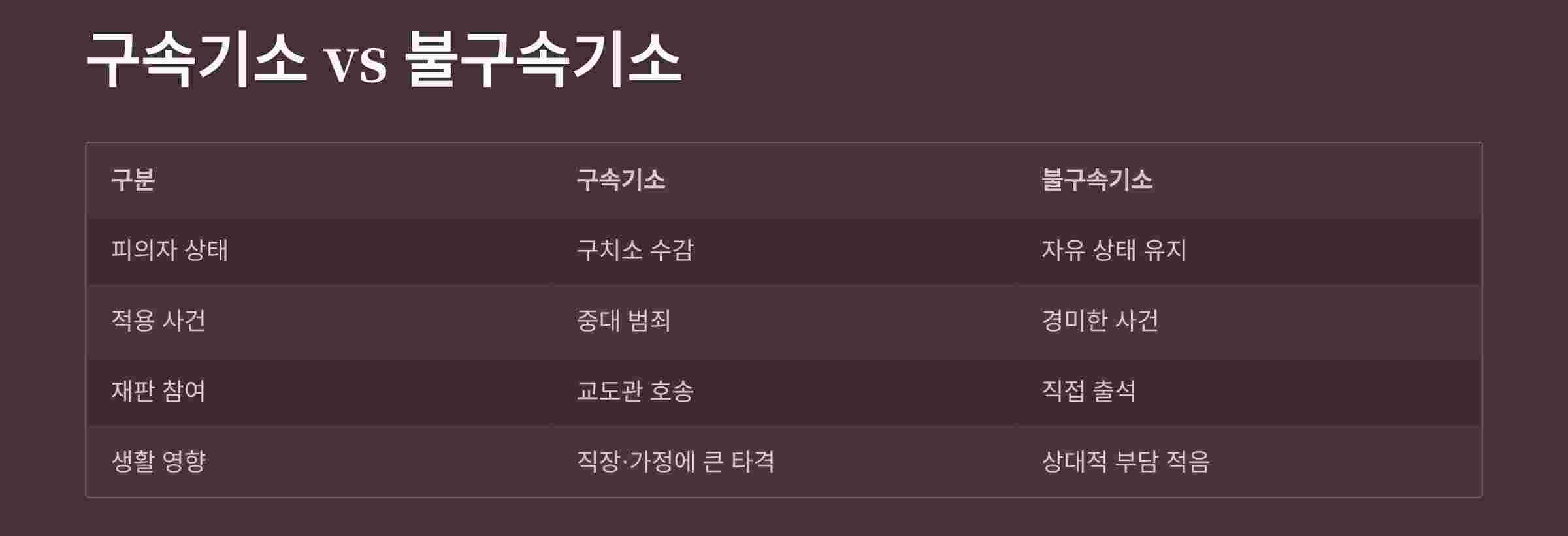 | 적용되는 사건 | 살인,강도 등 중대 범죄 | 경미하거나 증거인멸 우려가 적은 사건 |