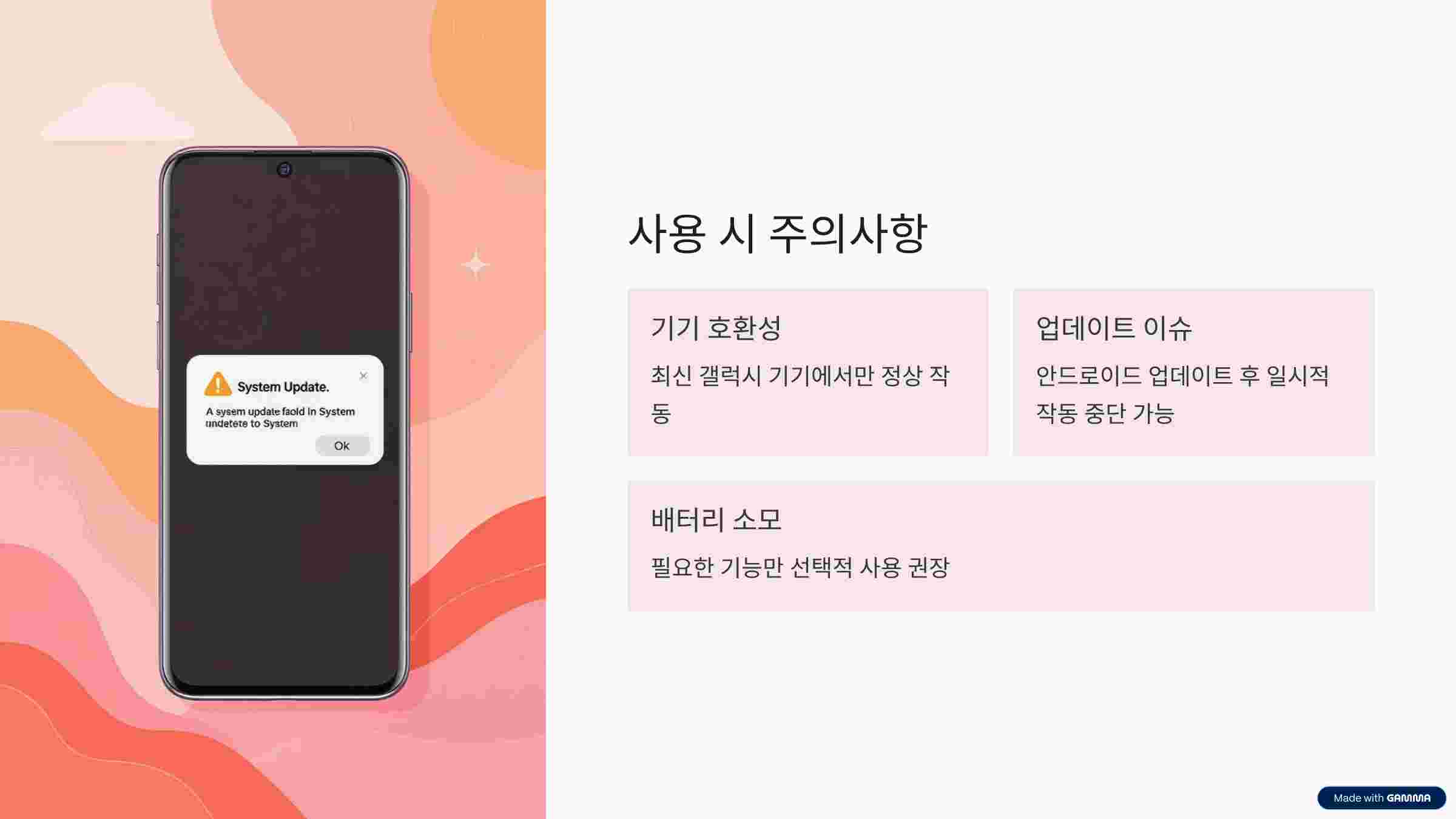 굿락은 최신 갤럭시 기기에서만 정상 작동합니다. 오래된 모델이나 일부 저가형 모델에서는 지원하지 않을 수 있습니다. 또한 안드로이드 업데이트 직후에는 모듈이 일시적으로 작동하지 않을 때도 있으니, 이 경우 업데이트 패치를 기다려야 합니다. 너무 많은 모듈을 동시에 적용하면 배터리 소모가 늘어날 수 있으므로 필요한 기능만 골라 쓰는 것이 좋습니다.
