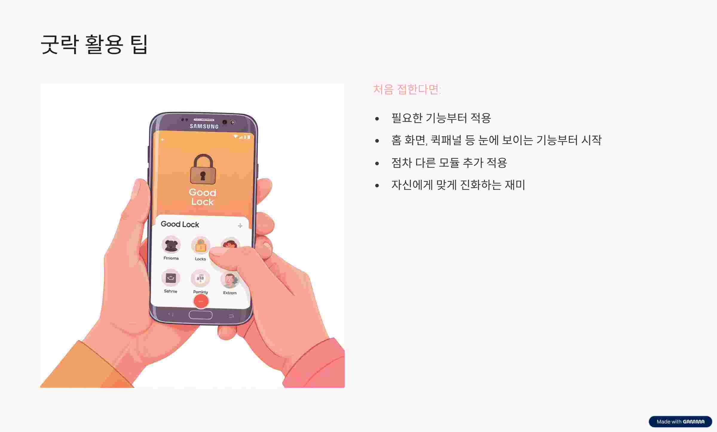 굿락은 삼성 갤럭시 스마트폰에서 제공하는 커스터마이징 앱으로, 화면 구성부터 버튼 동작까지 원하는 대로 바꿀 수 있는 기능을 제공합니다. 처음 접하면 조금 복잡하게 느껴질 수 있지만, 차근차근 따라 하면 금방 익숙해집니다. 아래에서 굿락의 주요 사용법과 활용 팁을 정리해 드리겠습니다.