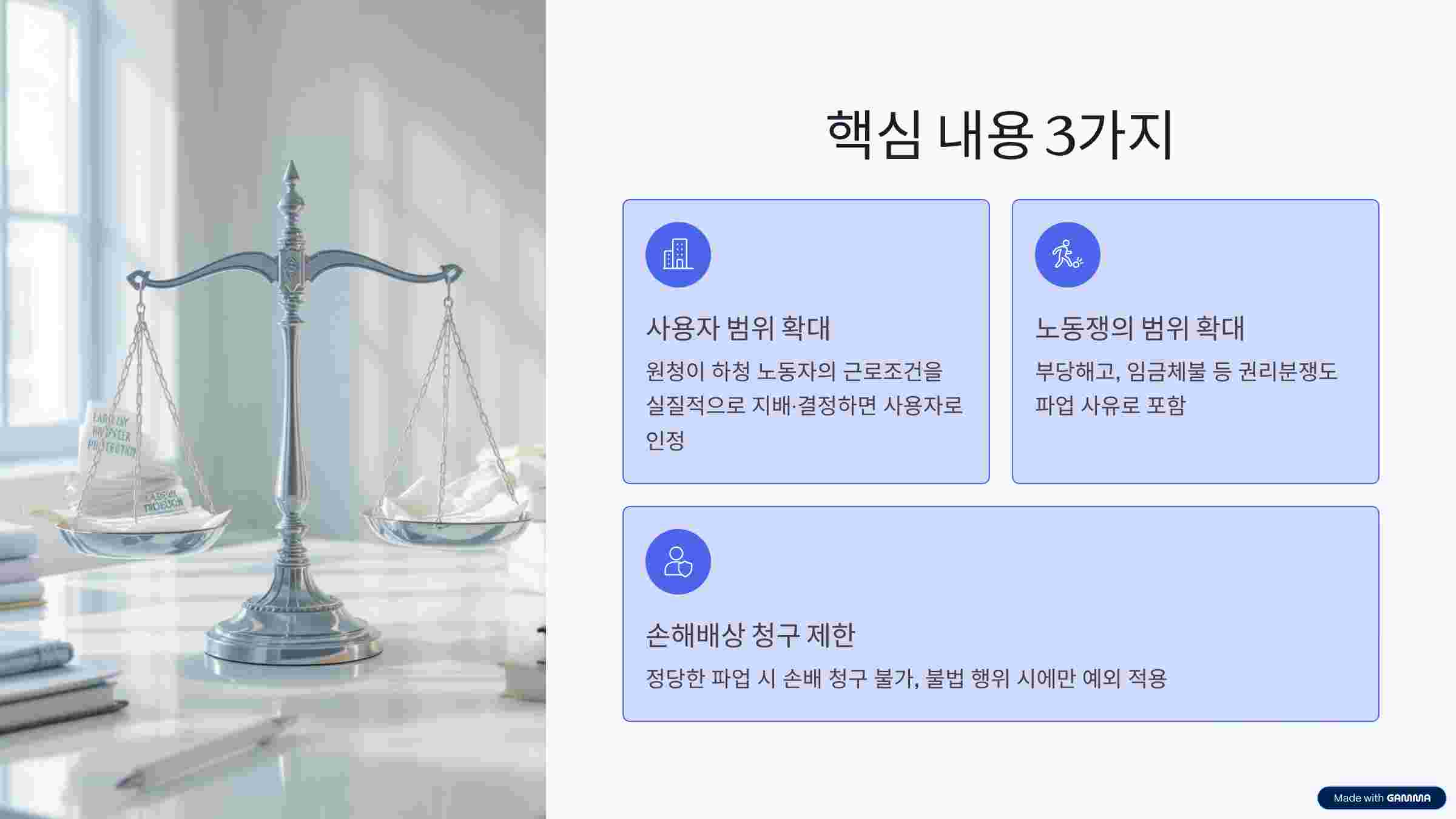 A. 원청 사용자 인정 확대, 권리분쟁 파업 허용, 정당한 파업에 대한 손해배상 청구 제한이 핵심 변화입니다.