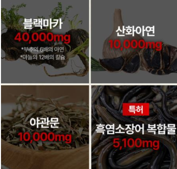 - 피로 회복 블랙마카와 흑염소, 장어 성분이 에너지 보충에 도움을 줍니다.