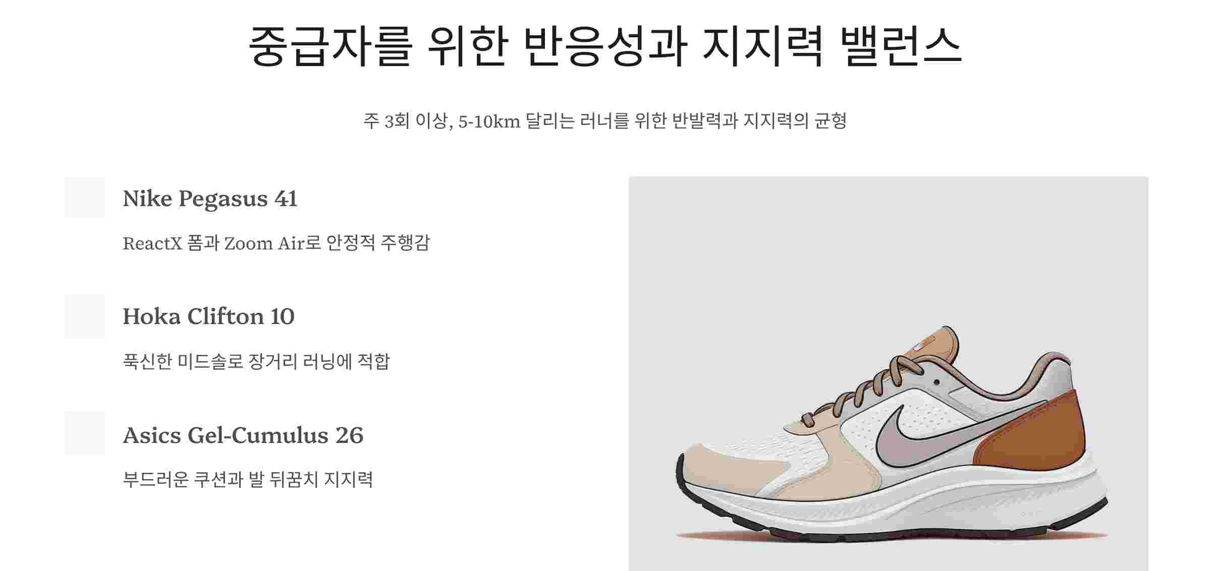 중급자용 신발은 ‘장거리 대비’와 ‘지속적인 페이스 유지’를 위한 설계가 특징입니다.