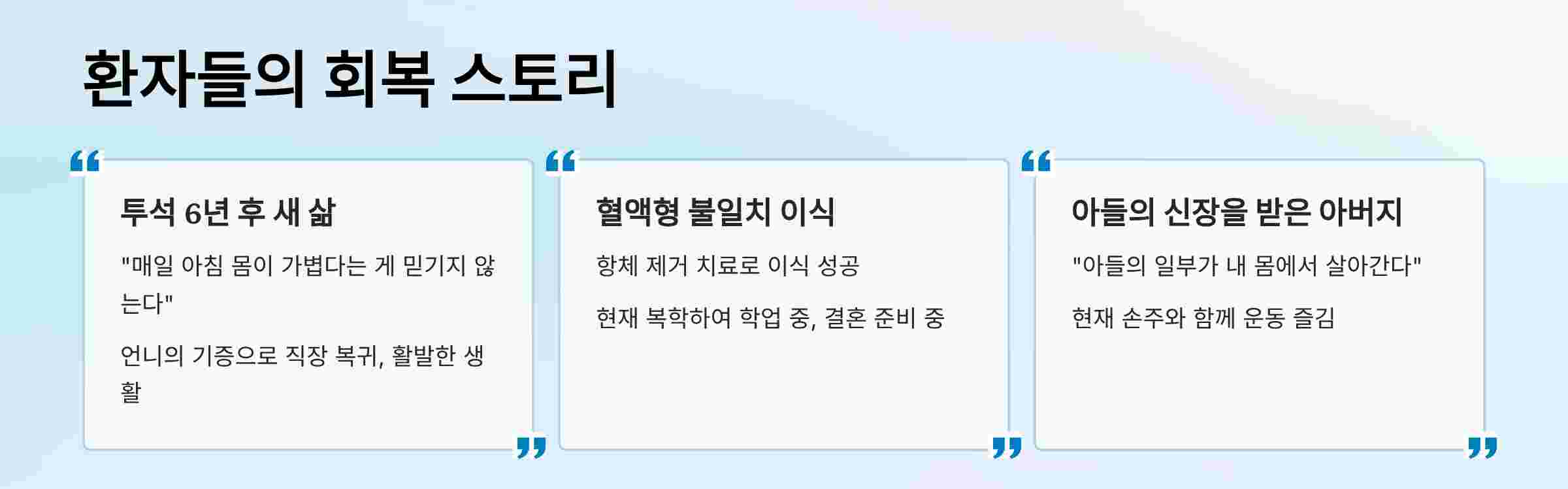| 서울아산병원 | 연간 300건 이상 이식,성공률 97% 이상 | 혈액형 불일치 이식 경험 풍부 | 다양한 케이스 경험을 원하는 환자 |