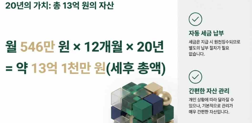 이를 20년 동안 합산하면 세후 총 실수령액은 약 13억 원 이상이 됩니다.